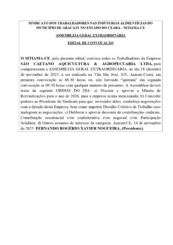 O SITIAMA-CE, pelo presente edital, convoca todos os Trabalhadores da Empresa
